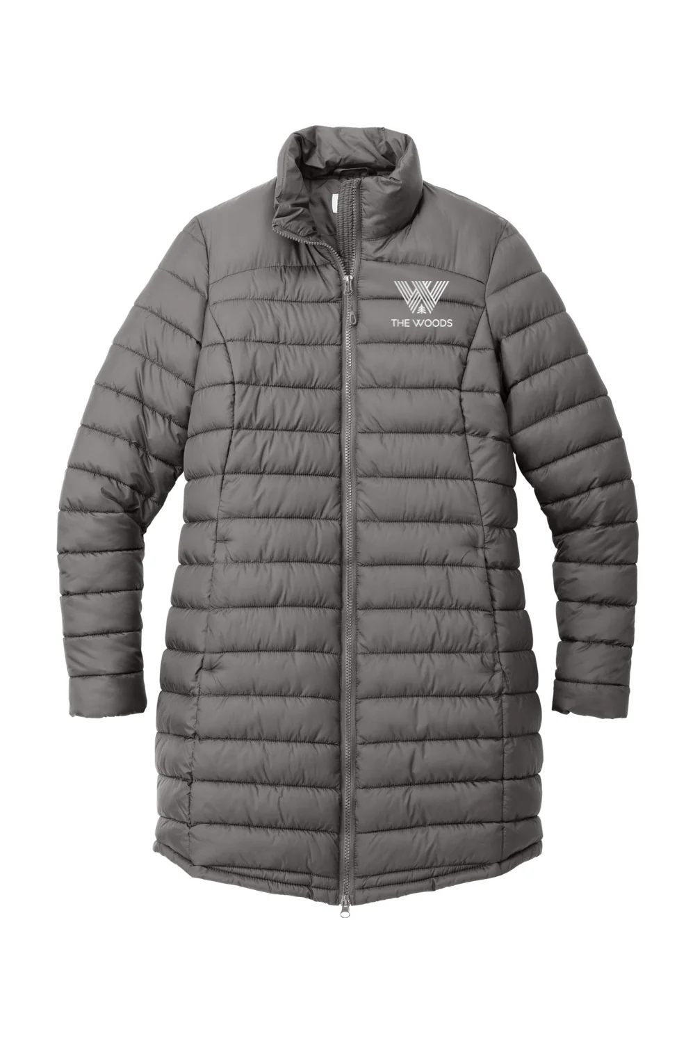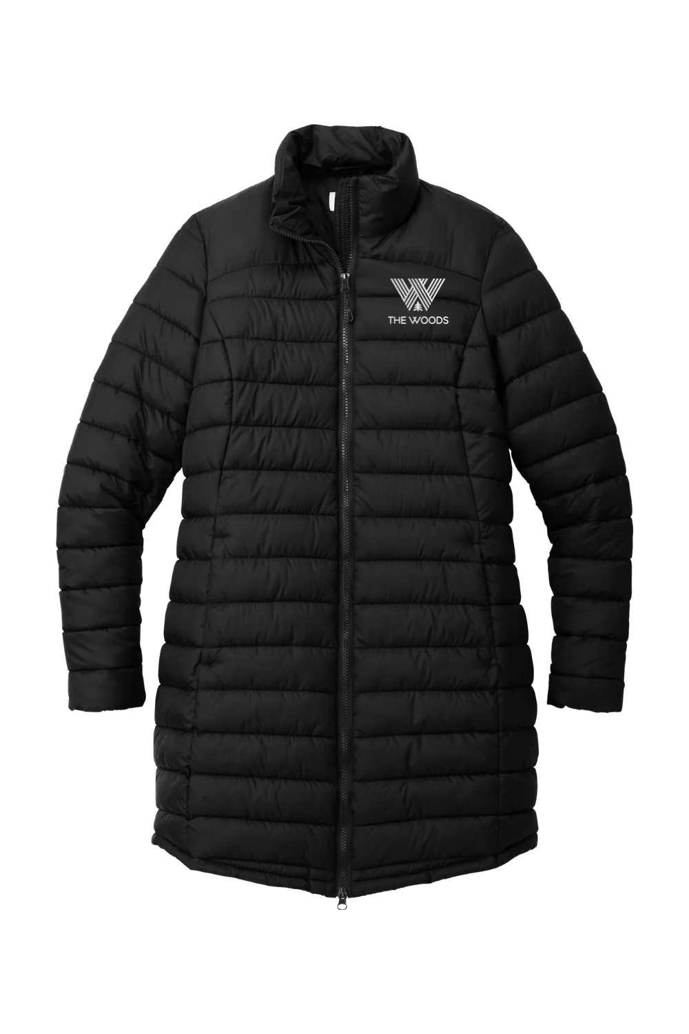 The Women’s Puffy Long Jacket offers a modern take on a cold weather classic with horizontal baffles, a subtle sheen, and lightweight insulation that delivers down like warmth without the bulk. Its water resistant shell helps shield against light rain, making it an effortless everyday layer. Designed for comfort and versatility, it features a two way molded zipper, hidden zippered hand pockets, and elastic cuffs for a secure fit. Finished with an embroidered logo on the left chest, it combines warmth, style, and a polished branded look built to handle the elements.
